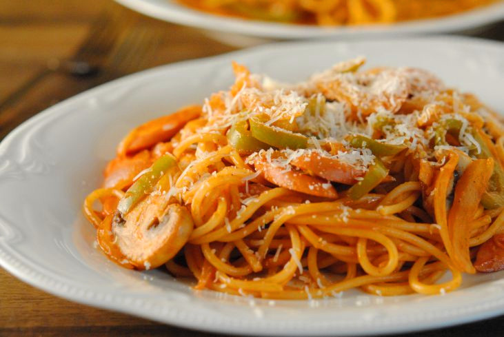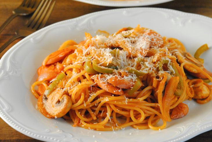 1. ソーセージ、マッシュルーム、玉ネギ、ピーマンを適当な大きさに切る