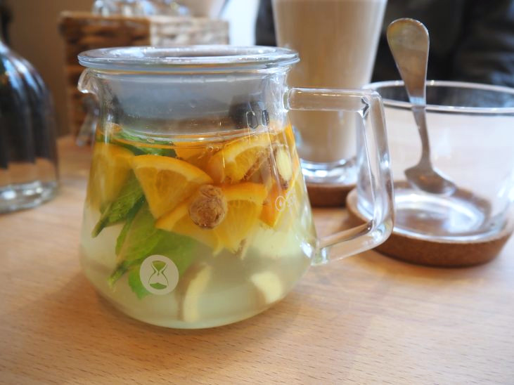 オレンジ、生姜、ミントで構成されたお茶。