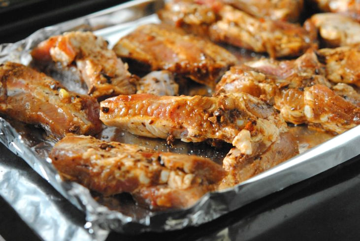 - 天板にアルミを敷き、油を少し塗って2のスペアリブを並べる