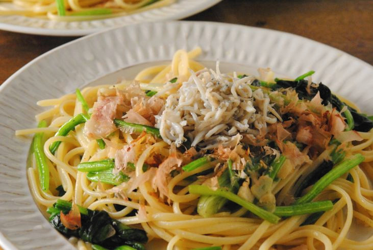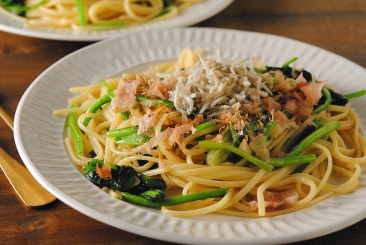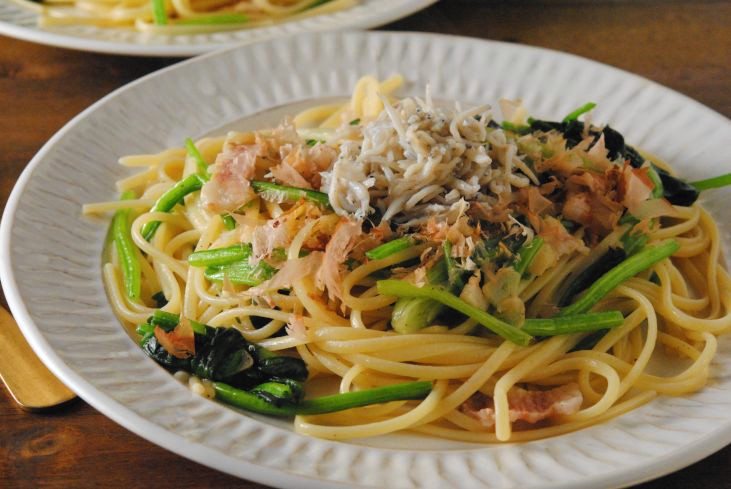 しらすをトッピング☆グアンチャーレとホウレン草のパスタ