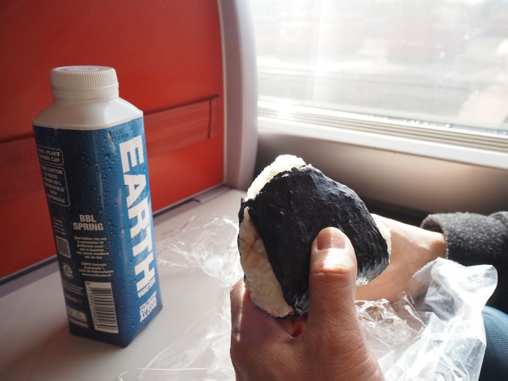パリへ向かうユーロスターの中で食べる家で作って来た朝食のオムスビ。