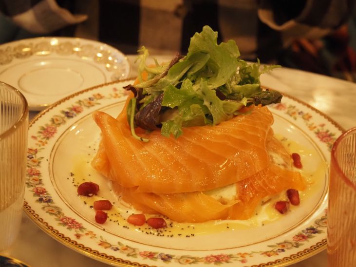 奥さんはスモークサーモン、アボカドクリーム、温玉の料理。