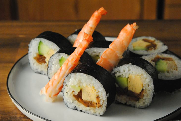 太巻きの中の具は玉子、かんぴょう、椎茸、海老、キュウリの5種類。