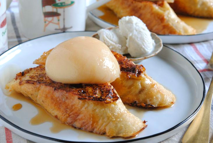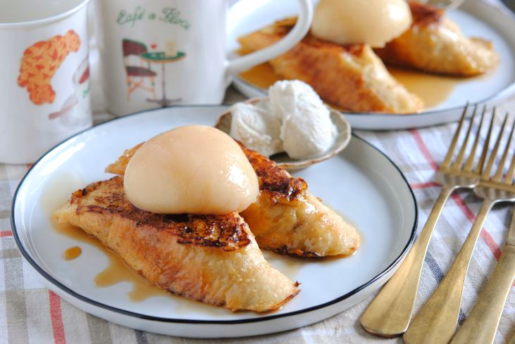 - お皿に盛り付けてメープルシロップと白桃缶のシロップをかけ、白桃をのっけて完成
