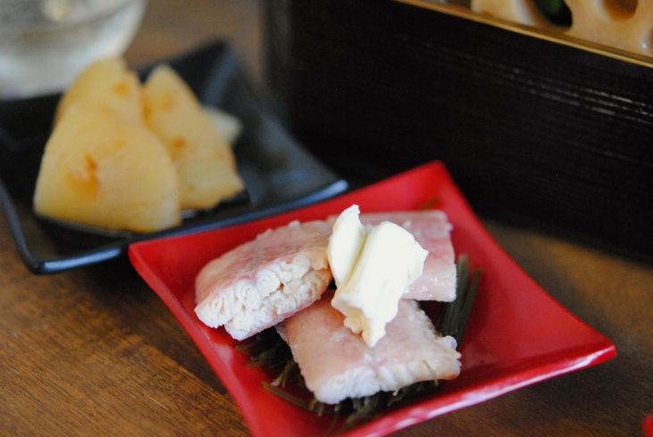数の子の隣に写ってるのは燻製の鰻にクリームチーズを乗っけた物。