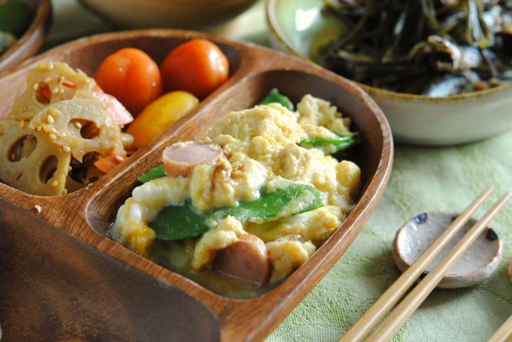 絹さやとソーセージの卵とじ。