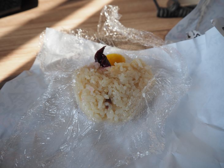 朝、のびのびと大浴場に入ってゆっくりした後、昨夜の鯛めしオムスビを頂く。